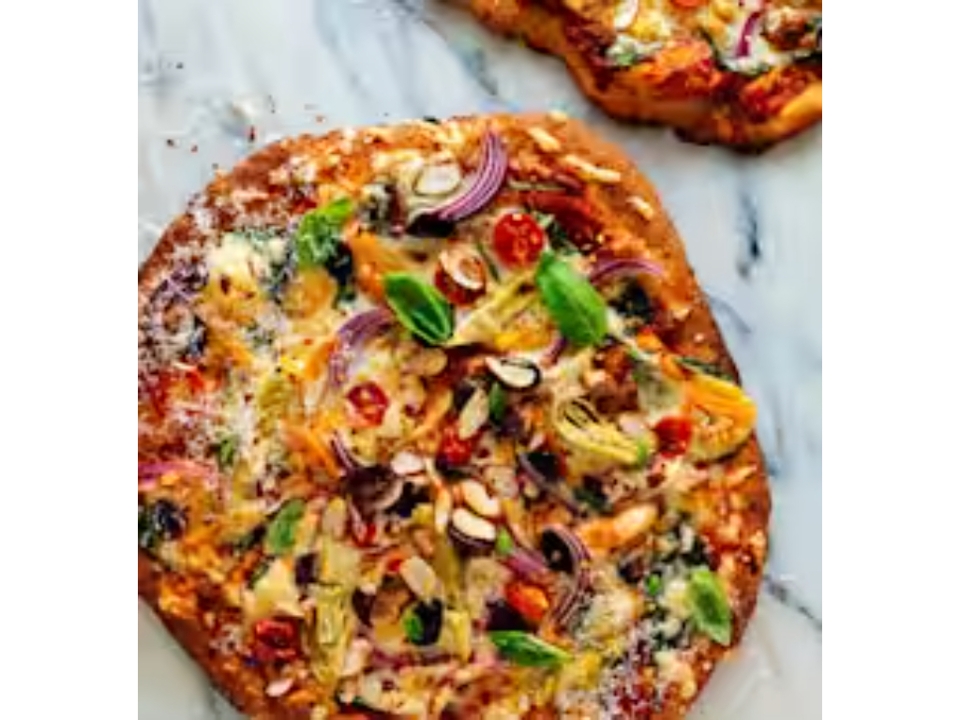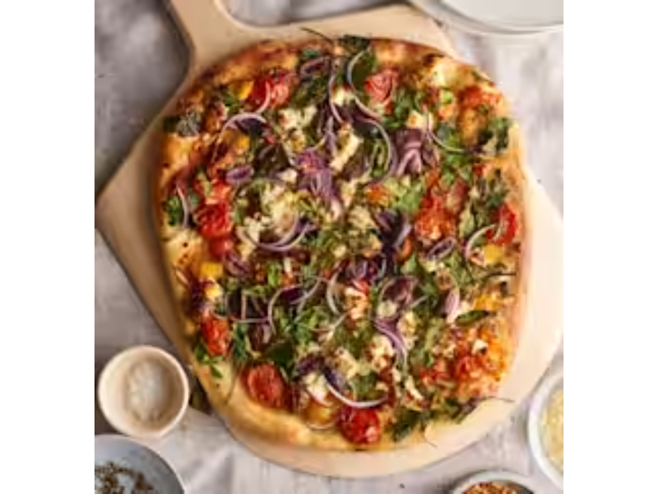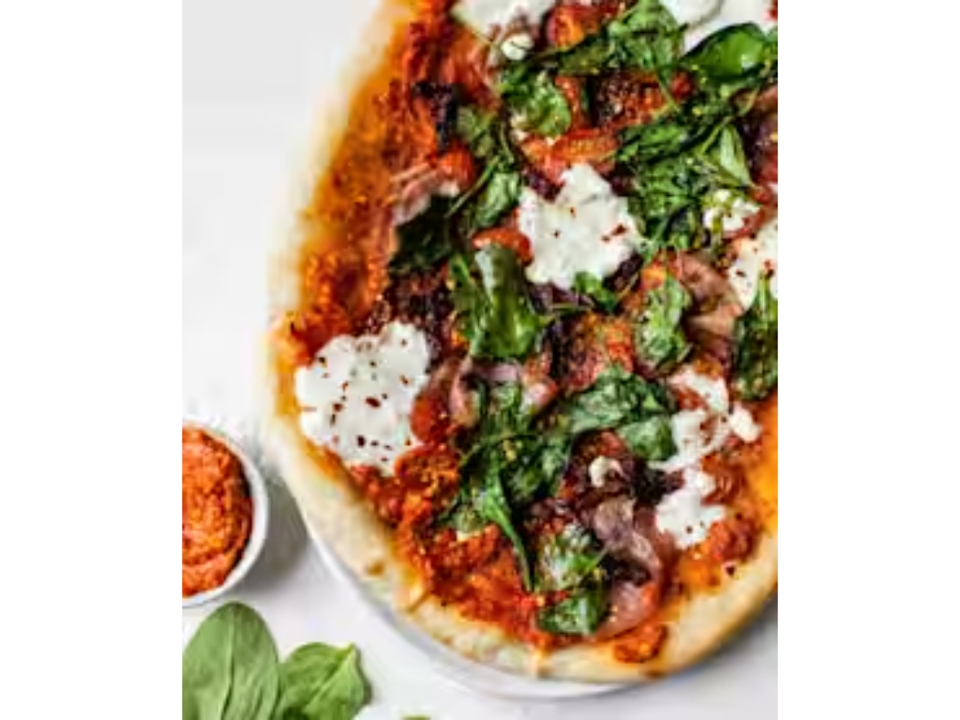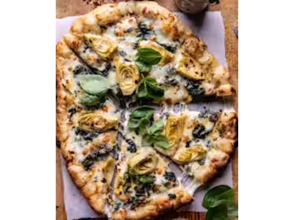 Mozzarella, artichoke hearts, zucchini, spinach, roasted garlic, roasted red pepper, basil and oregano