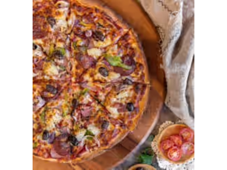 Pepperoni, tomatoes, mushrooms, sausage, beef, bacon, black olives, Canadian bacon, fresh garlic, green peppers, onions