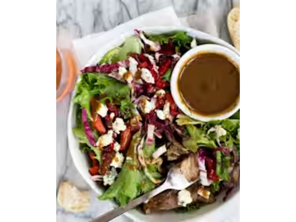 Fresh green lettuce mix with marinated beef, feta cheese, fresh mushrooms, tomatoes and tuscan balsamic vinaigrette dressing