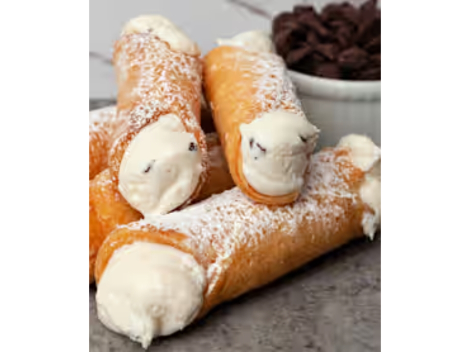 Tube-shaped shells of fried pastry dough dipped in chocolate, filled with a sweet, creamy filling containing sweetened ricotta cheese, vanilla, and powdered sugar