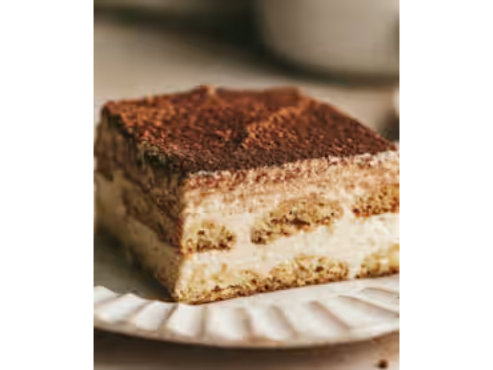 Two delicate layers of sponge cake saturated with espresso coffee and marsala. Then combined with a thick creamy layer of filling and mascarpone