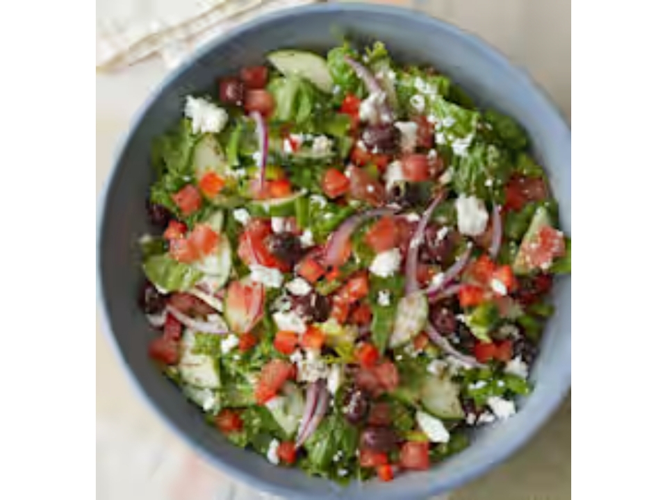 Lettuce, tomatoes, onions, green peppers, black and green olives and cheese