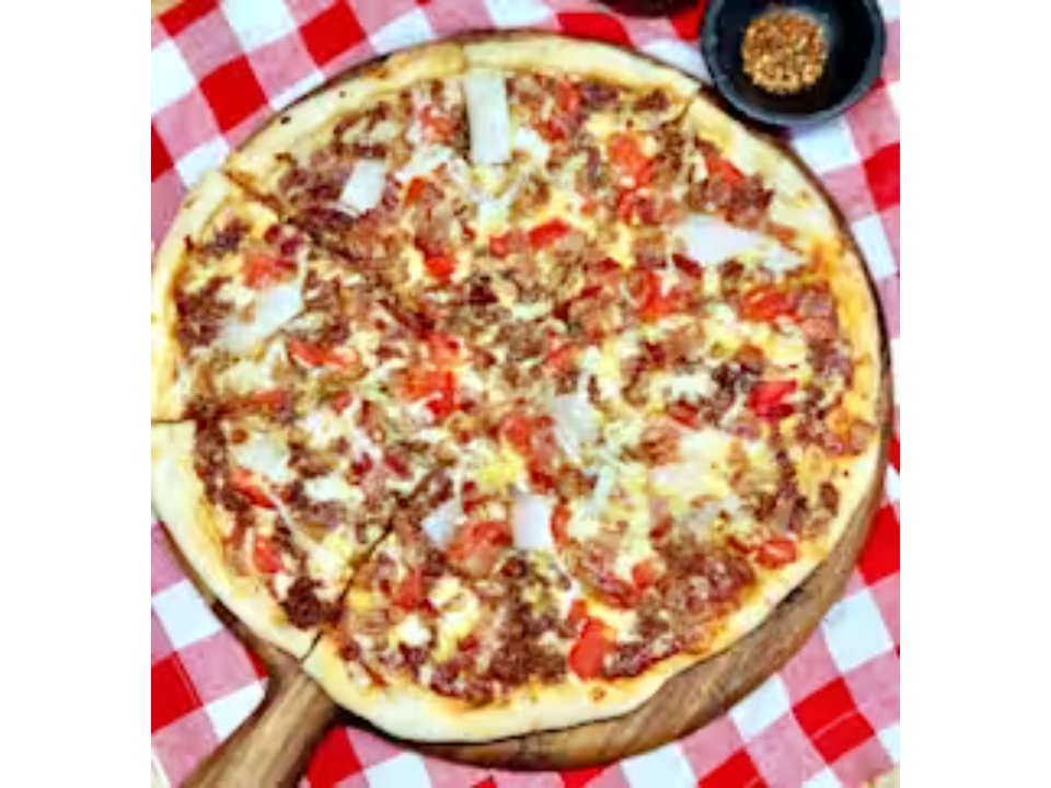 Ground beef, onion, jalapeño, tomatoes, provolone and cheddar cheese